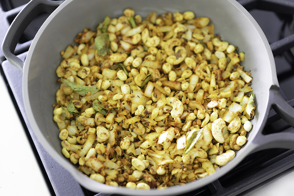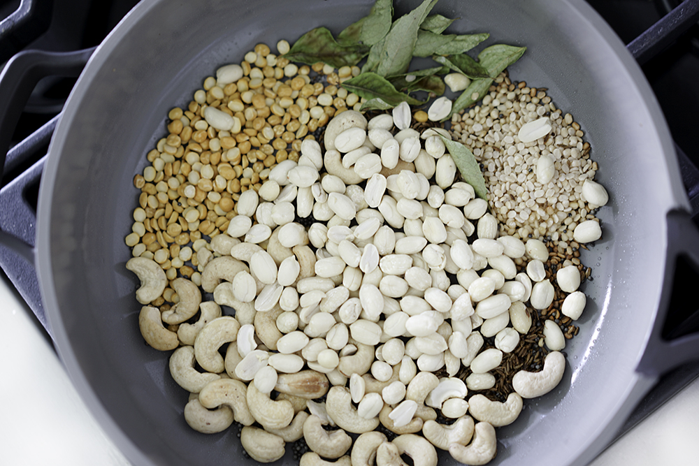 - Step 1 Heat oil in a non-stick pan over medium-high heat. Once hot, add in mustard seeds and cumin seeds and allow them to pop. After they pop, add in the chana dal, urad dal, peanuts, and cashews. Continue to cook for 2 minutes or until golden brown, do not allow them to burn.