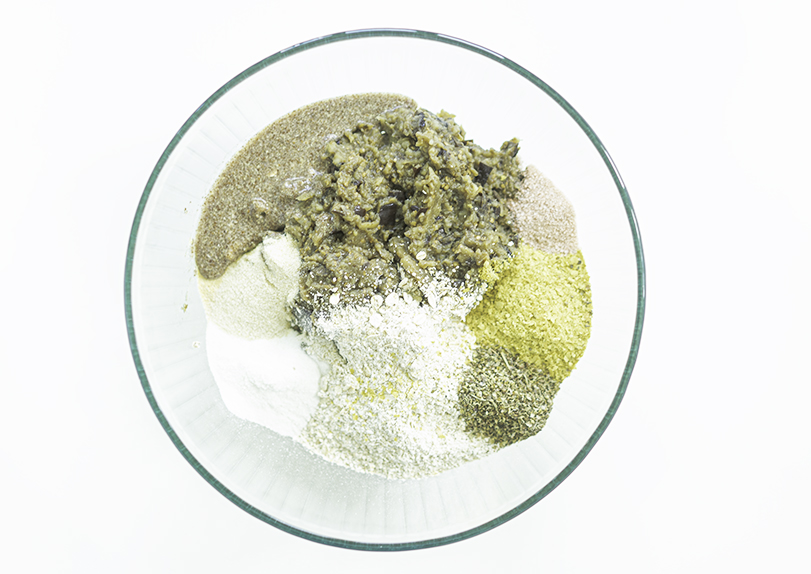 - Step 7 Add the eggplant + the flax egg to the dry ingredients. Gently stir. Do not use food processor for this step.
